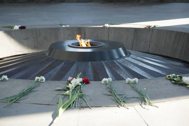 Wir steigen aus und begeben uns - an einer etwa 100 Meter langen Mauer, auf der sich die Namen all jener Dörfer und Städte befinden, in denen die Opfer des Genozides gelebt haben, und an dem 44 Meter in die Höhe ragenden gräulichen Obelisken vorbei - zu der ewigen Flamme, die von 12 schräg aufeinander zulaufenden Basaltplatten umgeben wird. Ringsum die lodernde Flamme sind Blumensträuße gelegt worden.