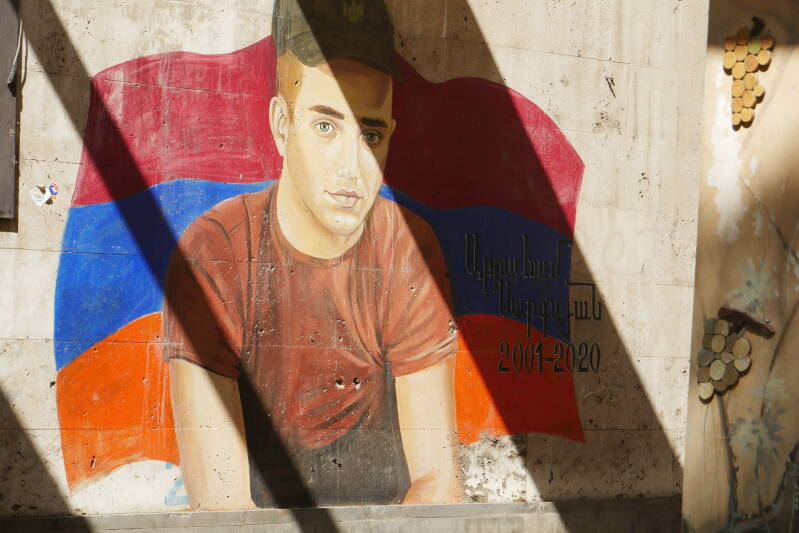 Tigran begleitet uns vor das Hotel, wo er sich eine Zigarette anzündet und uns erzählt, dass er im nächsten Jahr zum armenischen Militär müsse und Angst vor einer weiteren Ausweitung des Krieges habe. Nicht so sehr um sich selbst sorge er sich, sondern vor allem um seine Mutter und ihre Trauer, falls ihm etwas zustoßen sollte.